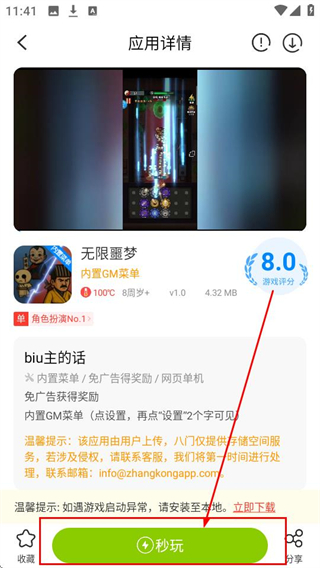 4、在应用详情页点击【秒玩】,就能立即开始玩《无限噩梦》,享受游戏乐趣啦。