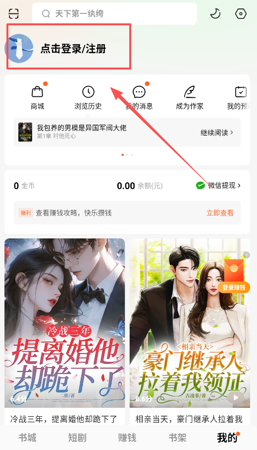 1、注册开启福利,点击首页的“点击登录/注册”完成注册,就能看到“海量漫剧免费看”的承诺。