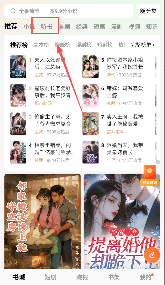 2、首页分类快速找书,进入“书城”后,顶部的“推荐、听书、漫剧”等标签能快速帮你筛选。