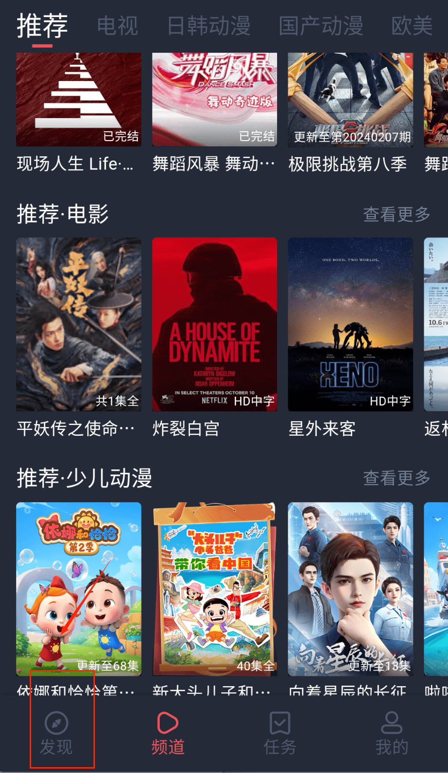 4、通过底部导航的发现页获取个性化推荐,系统根据观看记录智能推送相似作品,帮助拓展观影范围。