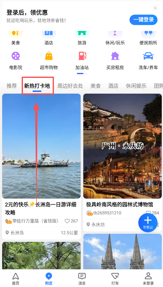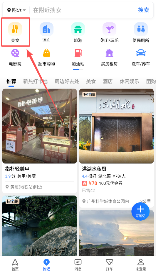 2、查找周边设施时,进入附近页,这里聚合了美食、旅游、便民厕所等多种类别,直接点选所需服务。