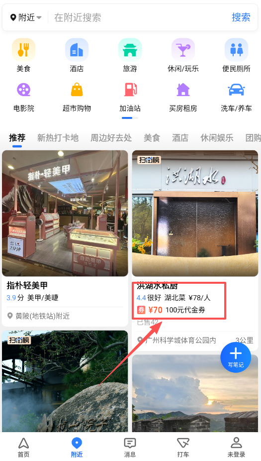 4、留意附近页面里的推荐板块,那里常有新热打卡地和商家优惠券,能省下不少钱呢。