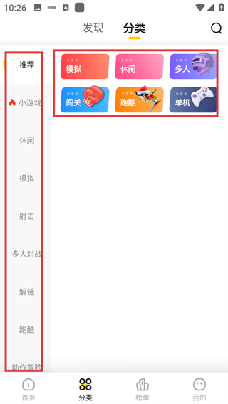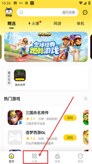 1、在【阿米游】主界面点击底部【分类】选项,就能进入游戏分类页面,找到不同类型的游戏入口啦。