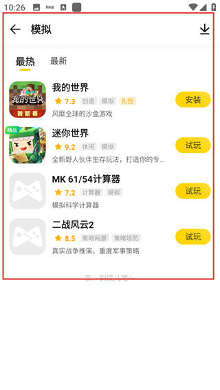 3、在模拟类游戏列表里找到目标游戏,比如【迷你世界】,就能看到它的评分和简介,准备进行体验啦。