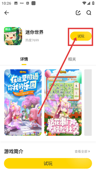 4、进入【迷你世界】详情页后,点击右上角或底部的【试玩】按钮,就能直接进入游戏开始体验啦。