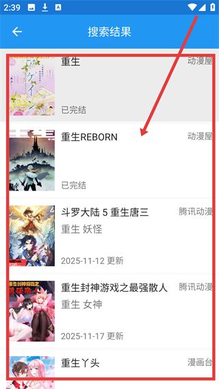3、搜索结果出来后,选目标漫画条目,就能进入它的详情页面查看内容啦。