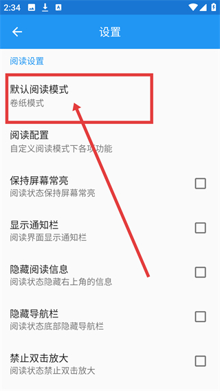 3、在设置界面点击【默认阅读模式】,触发阅读模式的选择弹窗哦。