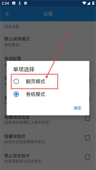 4、在弹窗里选择【翻页模式】,点击【确定】,即可将默认阅读模式切换为翻页啦。
