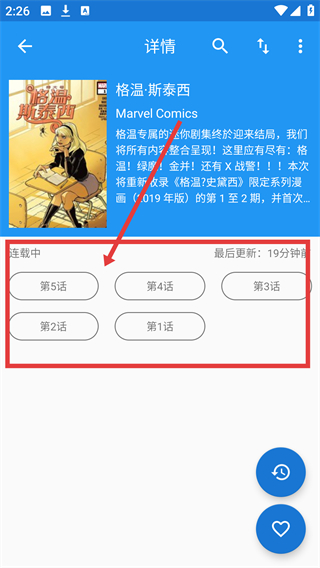 2、进入漫画详情页后,能看到各话的章节按钮,点对应章节就能开始阅读该话内容哦。