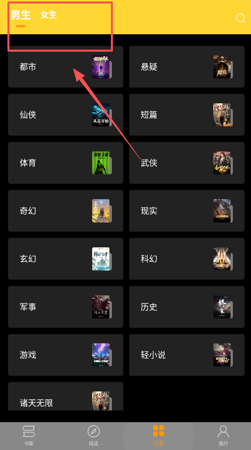 2、“分类”频道是更精细的找书工具,区分了男生女生视角,并列出奇幻、军事等大量子类别,适合目标明确的深度搜寻。