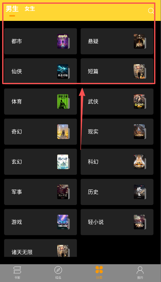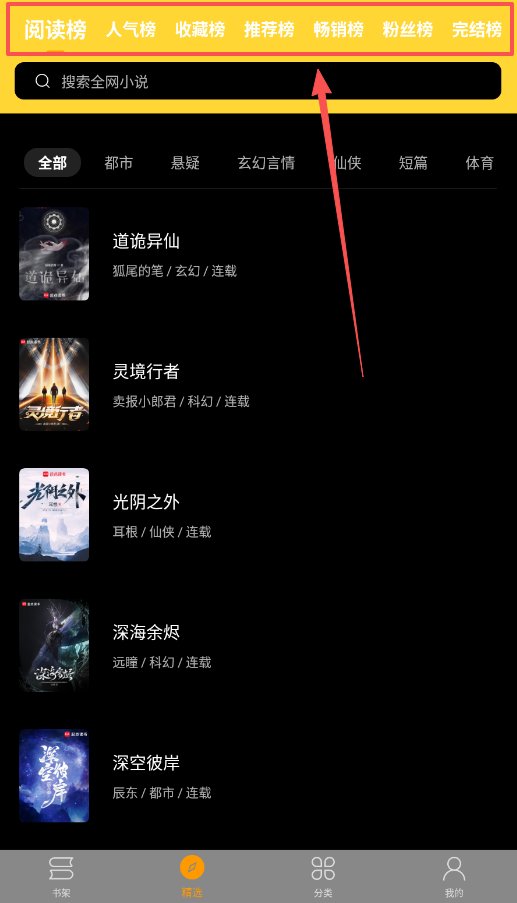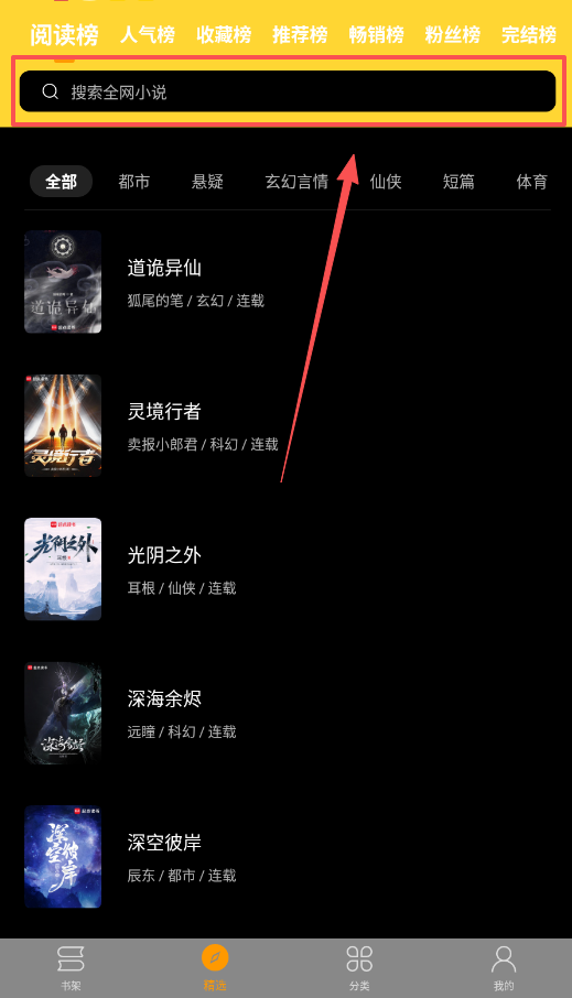 2、若有明确想读的书,直接使用顶部搜索框“搜索全网小说”,若没有目标,可多逛逛不同榜单。