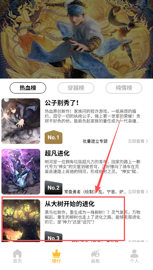 1、 如果你想轻松找些好看的漫画消磨时间,直接点开“排行”页就好了,各种榜单分类明确,一眼就能看到当下最火的几部作品。