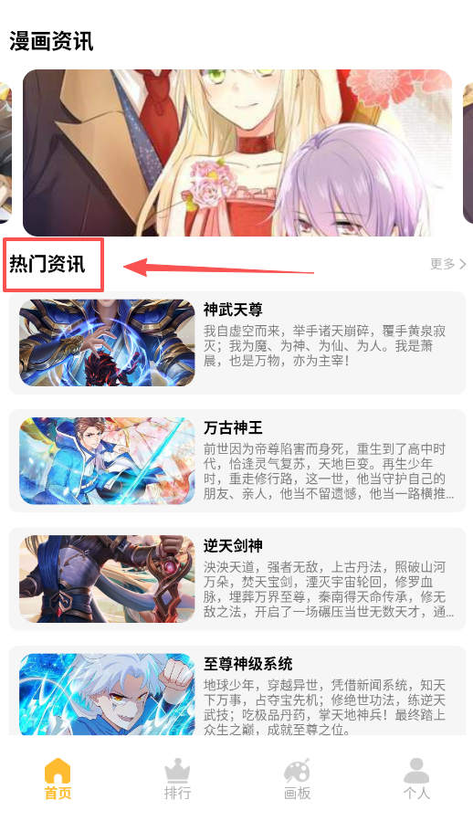 3、 首页的“热门资讯”也是发现新故事的好地方,它会用一小段话介绍如逆天剑神这样的作品背景,比直接看书名更容易找到合你口味的。