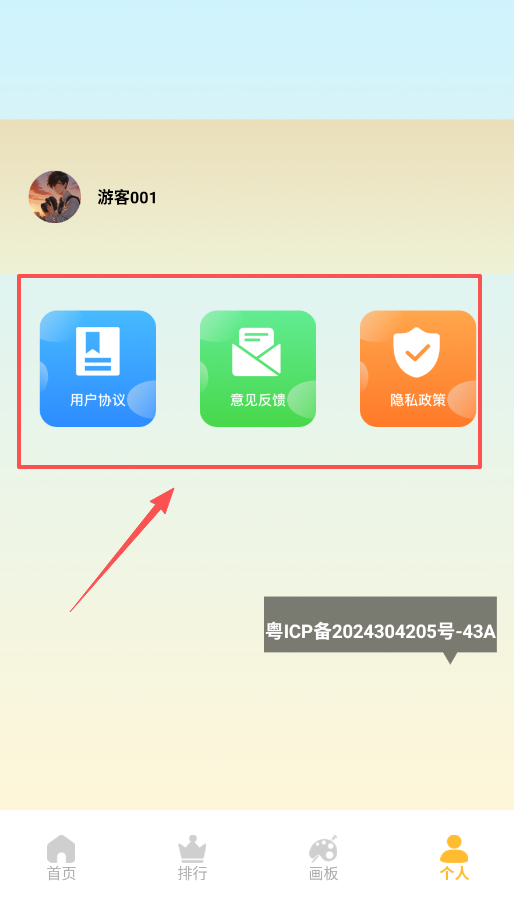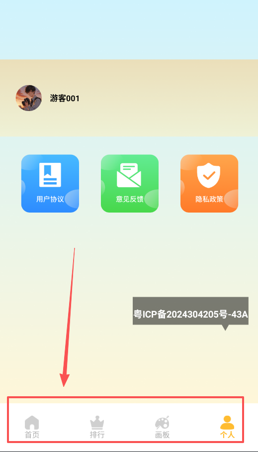 1、 首次打开软件,先熟悉底部的四大入口,首页、排行、画板和个人中心,通过点击即可在各模块间跳转。