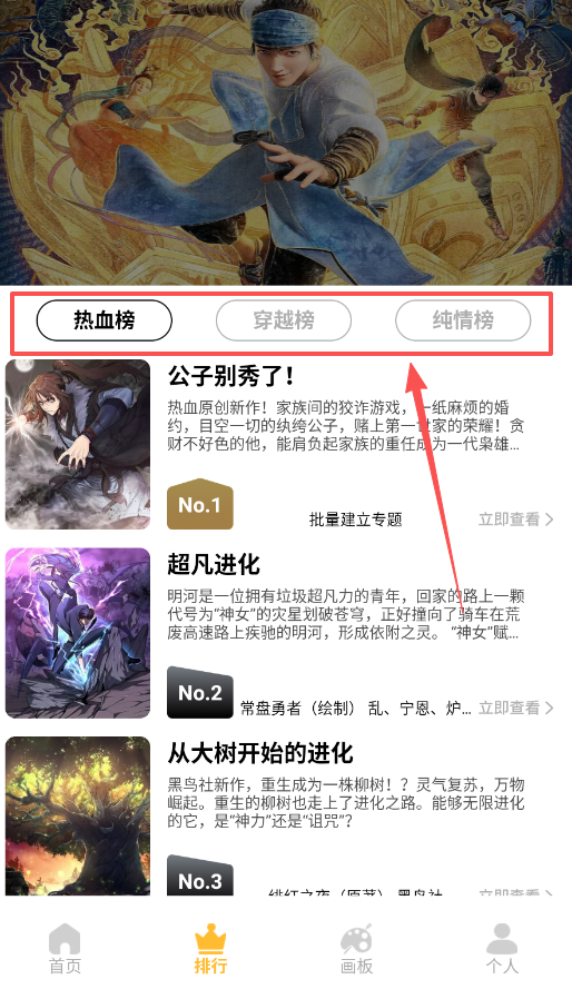 2、 想快速找书,推荐直接点击“排行”页,这里的热血榜、穿越榜等分类榜单,能帮你了解当前热门作品。