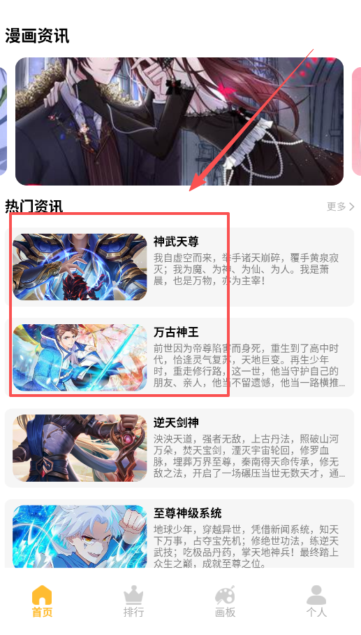 3、 拿不准是否喜欢某部漫画,可以回到“首页”浏览“漫画资讯”板块,这里的故事简介如神武天尊、万古神王。