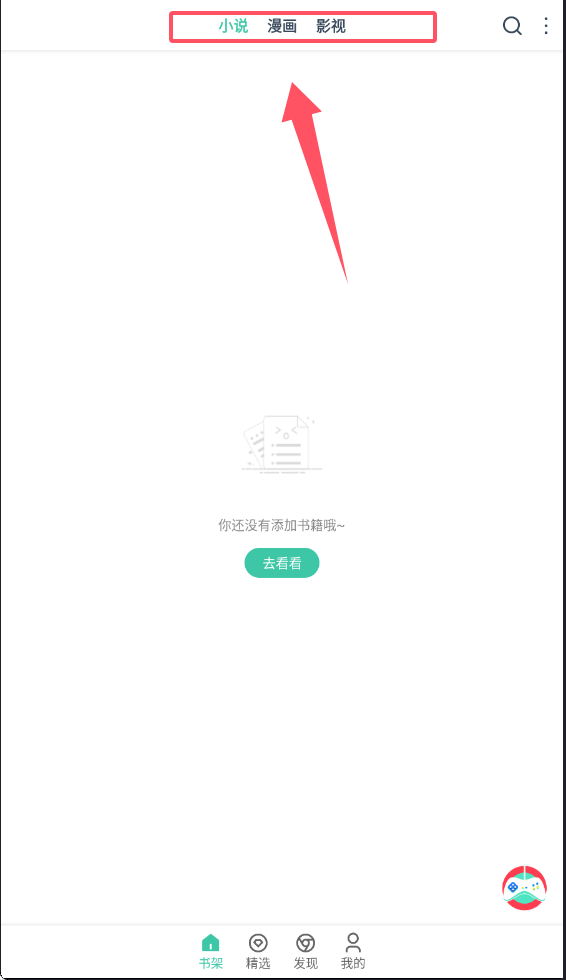 2、在精选页面可以看到小说、漫画、影视三个分类标签,点击能切换不同类型的内容推荐。如果暂时没有收藏任何书籍。