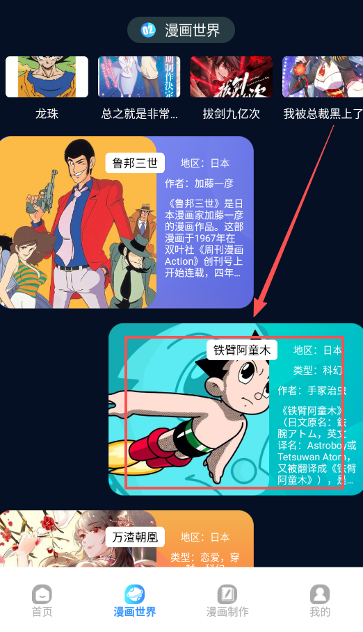 2、深入漫画世界板块,探索龙珠、鲁邦三世等海量资源,通过查阅作品摘要和背景信息,轻松发现你的心头所好。