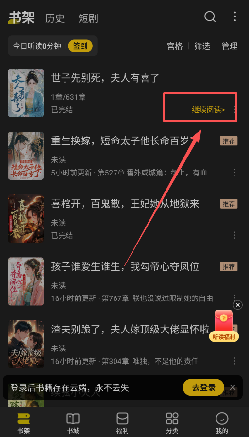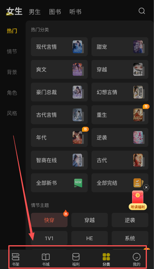 1、打开软件后,底部导航栏有“书架、书城、福利、分类、我的”五个主要入口直接点击感兴趣的标签就能浏览对应书单。