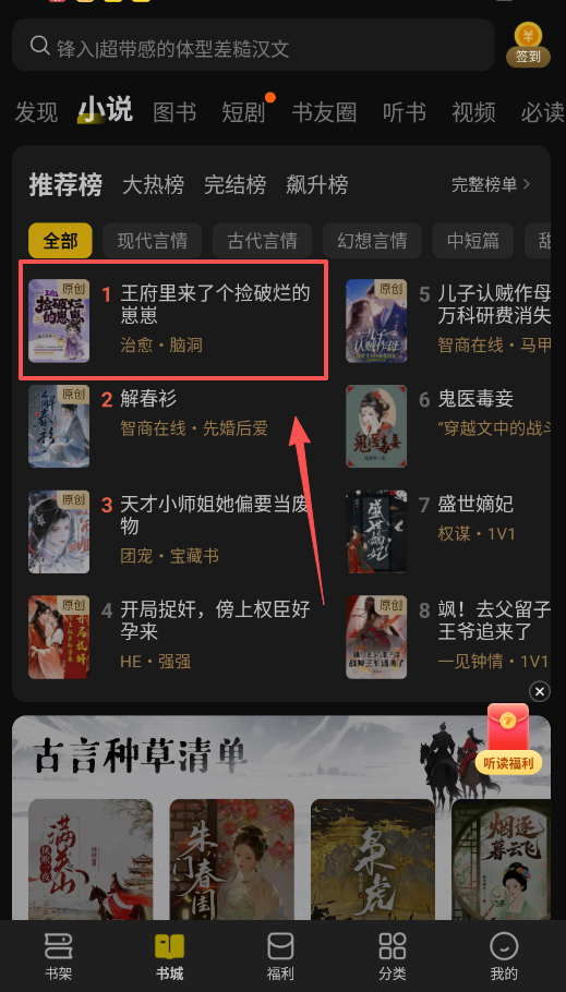 2、找到喜欢的小说,例如榜单上的“王府里来了个捡破烂的悬崖”或“解春衫”,点击书籍封面或标题就能进入详情页。