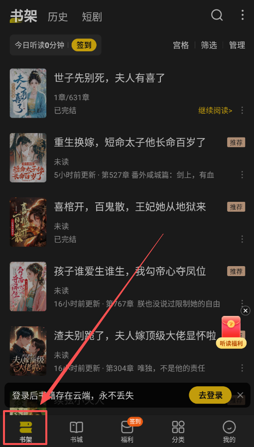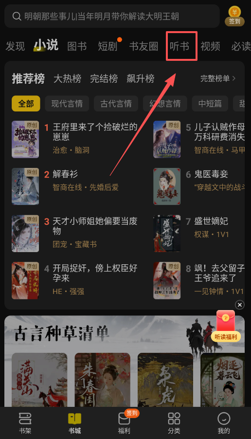 1、首先在“书城”页面,你可以通过顶部的“男生、女生、图书、听书”切换频道,直接查看“推荐榜、飙升榜”等榜单发现热门好书。