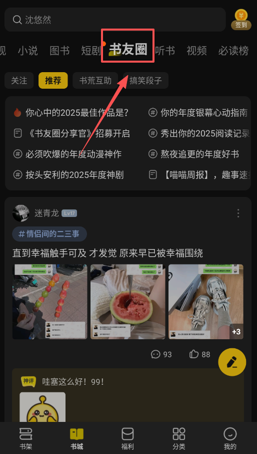 4、最后在“发现”或“书友圈”页面,你可以参与“七猫年度作家”等活动获取福利,用“短剧、听书”等功能切换娱乐方式。