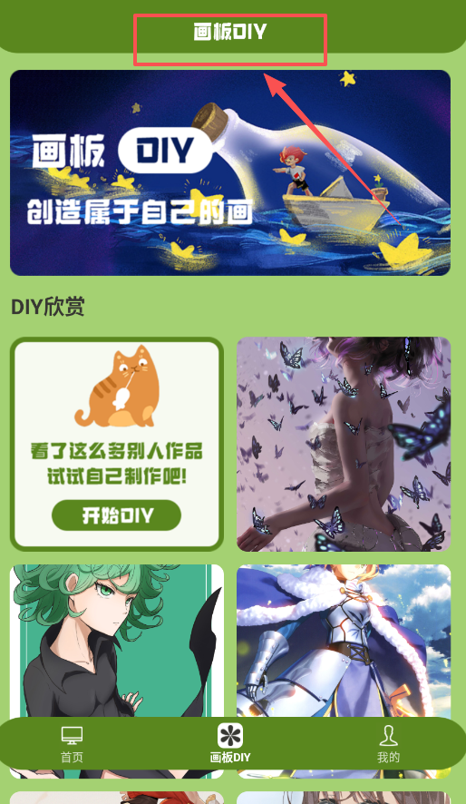 2、创作时间到“画板DIY”板块,这里有“创造属于自己的画”的提示,浏览“DIY欣赏”后,点击“开始DIY”即可使用绘画工具进行创作。