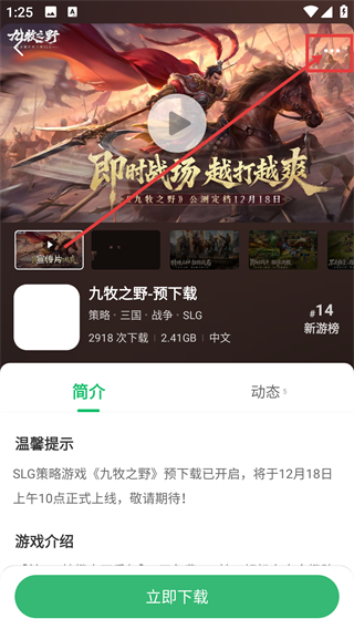 1、在首页点击游戏宣传图(如【九牧之野】),就能进入对应的游戏详情页面,查看游戏信息啦。