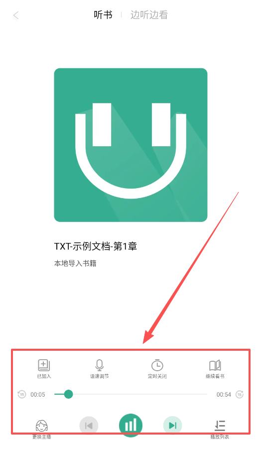 3、打开文档后,进入听书界面,能看到播放进度和定时关闭等实用按钮,播放列表里会保存你的听书记录。