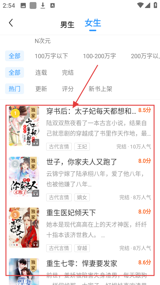 1、在女生小说分类页面,有热门小说如【穿书后:太子妃每天都想和离】,点击它可进入小说详情页,了解小说内容哦。