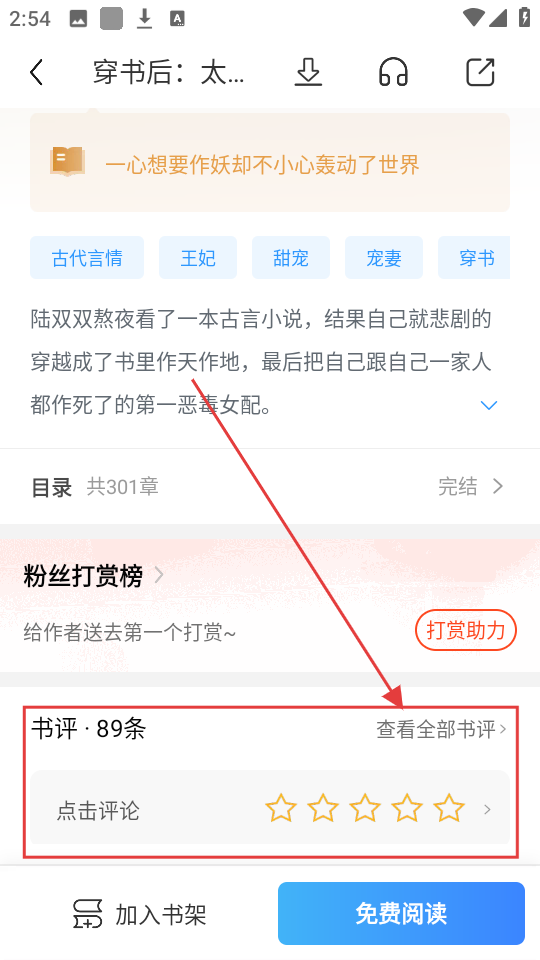 2、进入小说详情页后,点击【查看全部书评】,可进入书评页面,查看其他读者的评论啦。