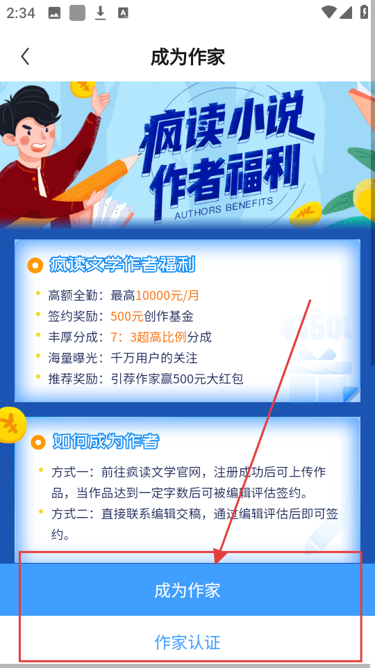 3、在成为作家详情页面,点击【成为作家】按钮,可进入登录页面,准备登录操作哦。
