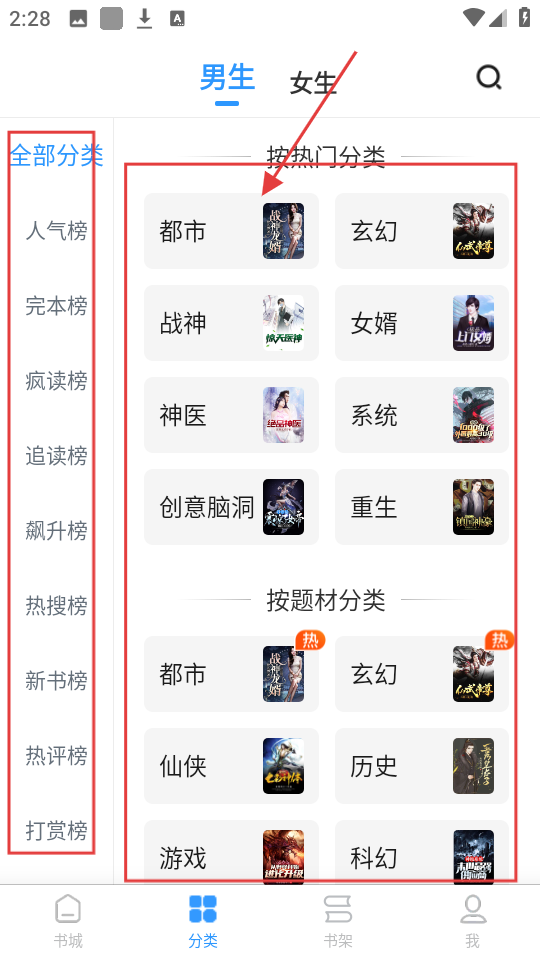 1、打开APP的分类页面,选择男生频道,在全部分类中挑选感兴趣的小说分类,比如【玄幻】啦。