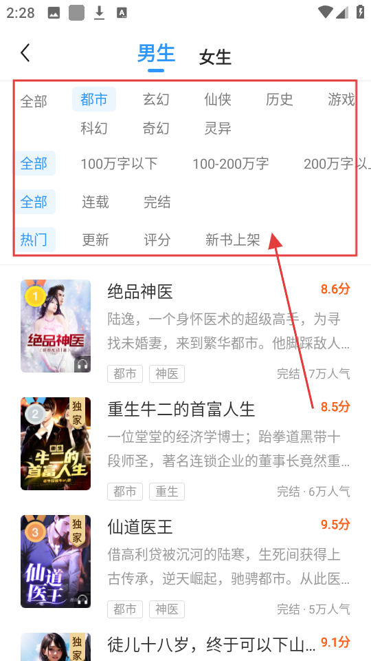 2、进入分类页面后,设置筛选条件,如字数、连载状态、排序方式等,缩小小说查找范围哦。