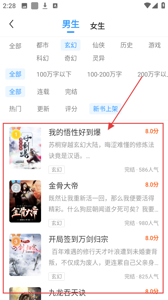 3、筛选完成后,在小说列表中选择目标小说,比如【我的悟性好到爆】,点击进入小说详情页呢。