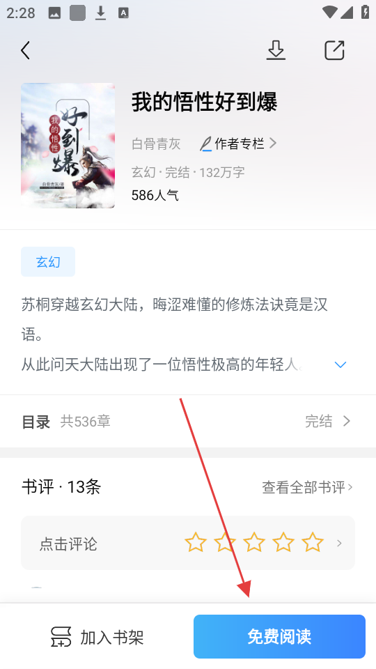 4、在小说详情页,点击【免费阅读】按钮,即可开始阅读该小说,享受阅读乐趣啦。