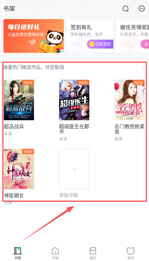 1、进入App后首先关注书架页面的福利板块,每日签到和任务奖励能获得不少阅读资源。