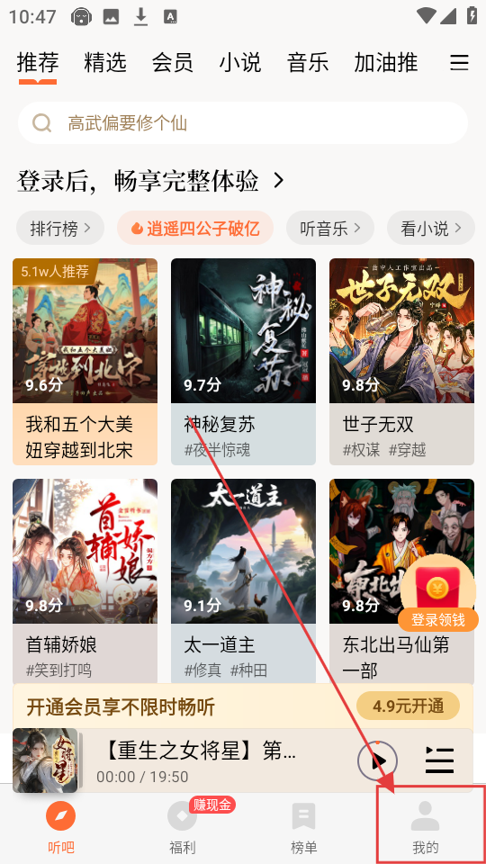 2、点击任务中心,完成任务可以赚积分,用来兑换VIP会员和听读劵。