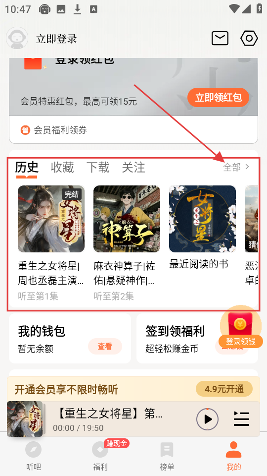 2、进入个人中心后,在历史区域能看到听书、阅读等历史内容,点击【全部】,就能看到更完整的历史记录咯。