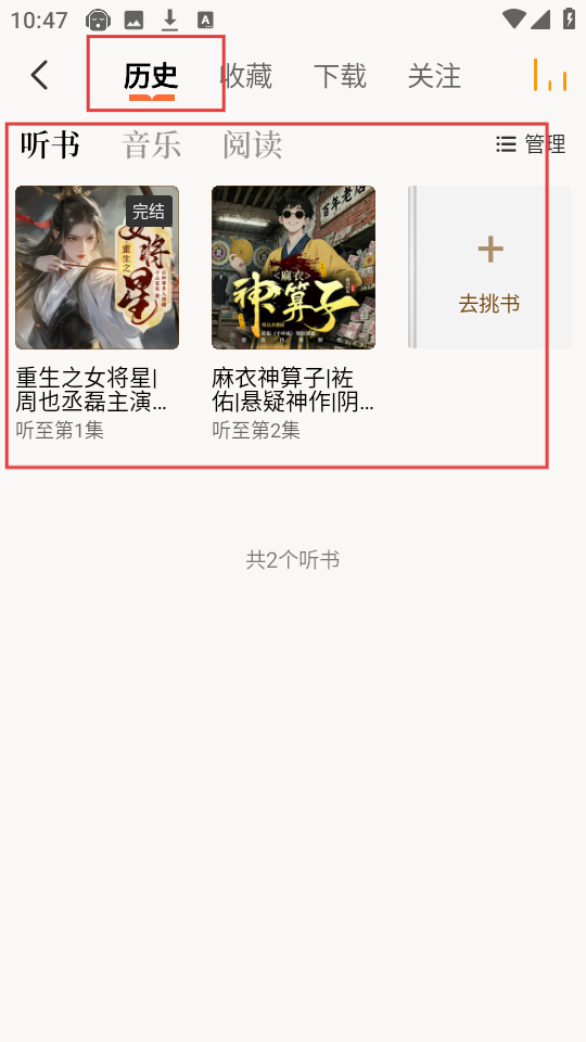 3、进入历史全部页面后,切换到【历史】板块,这里能看到听书相关的历史记录,方便咱们继续之前的听书内容呢。