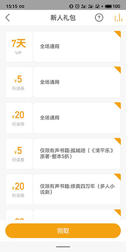 4、如果你是新用户,还可以领取新手礼包,里面包含VIP与听读劵。