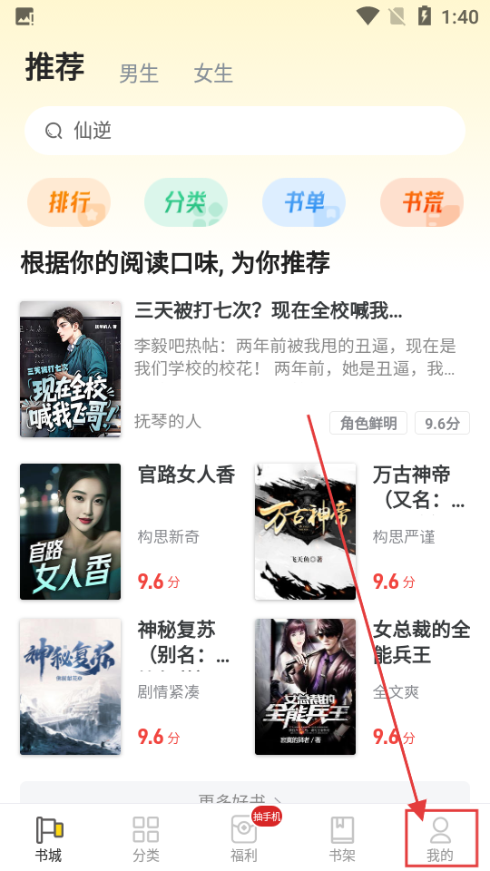 1、我们进入小说软件,能看到推荐小说等内容,若要查看个人相关信息,点击右下角【我的】吧。