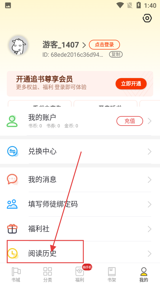 2、进入“我的”页面,能看到账户、兑换中心等选项,若要查看阅读过的小说,点击【阅读历史】哦。