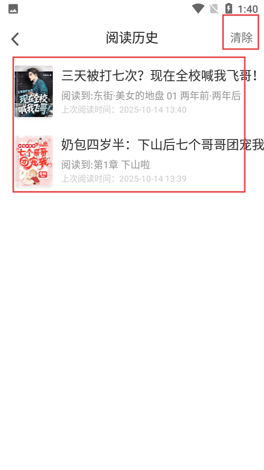 3、进入阅读历史页面,能看到之前阅读的小说列表,若要清空这些记录,点击【清除】呀。