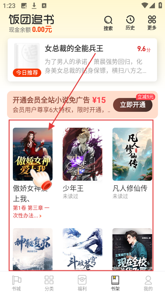 1、打开饭团追书,在书架下载想看的小说,像【傲娇女神爱上我】,看中了就点击它,开启阅读吧。