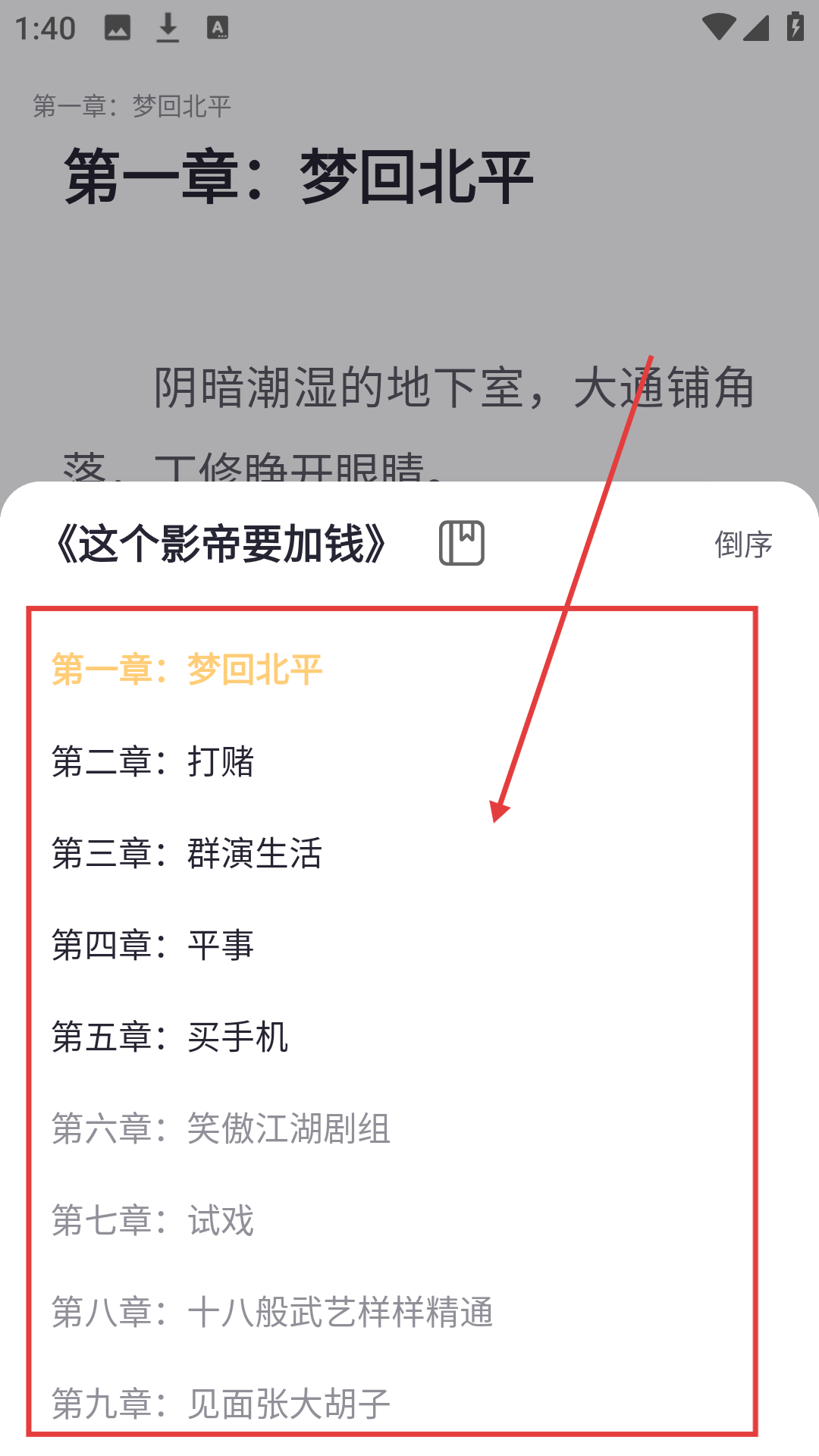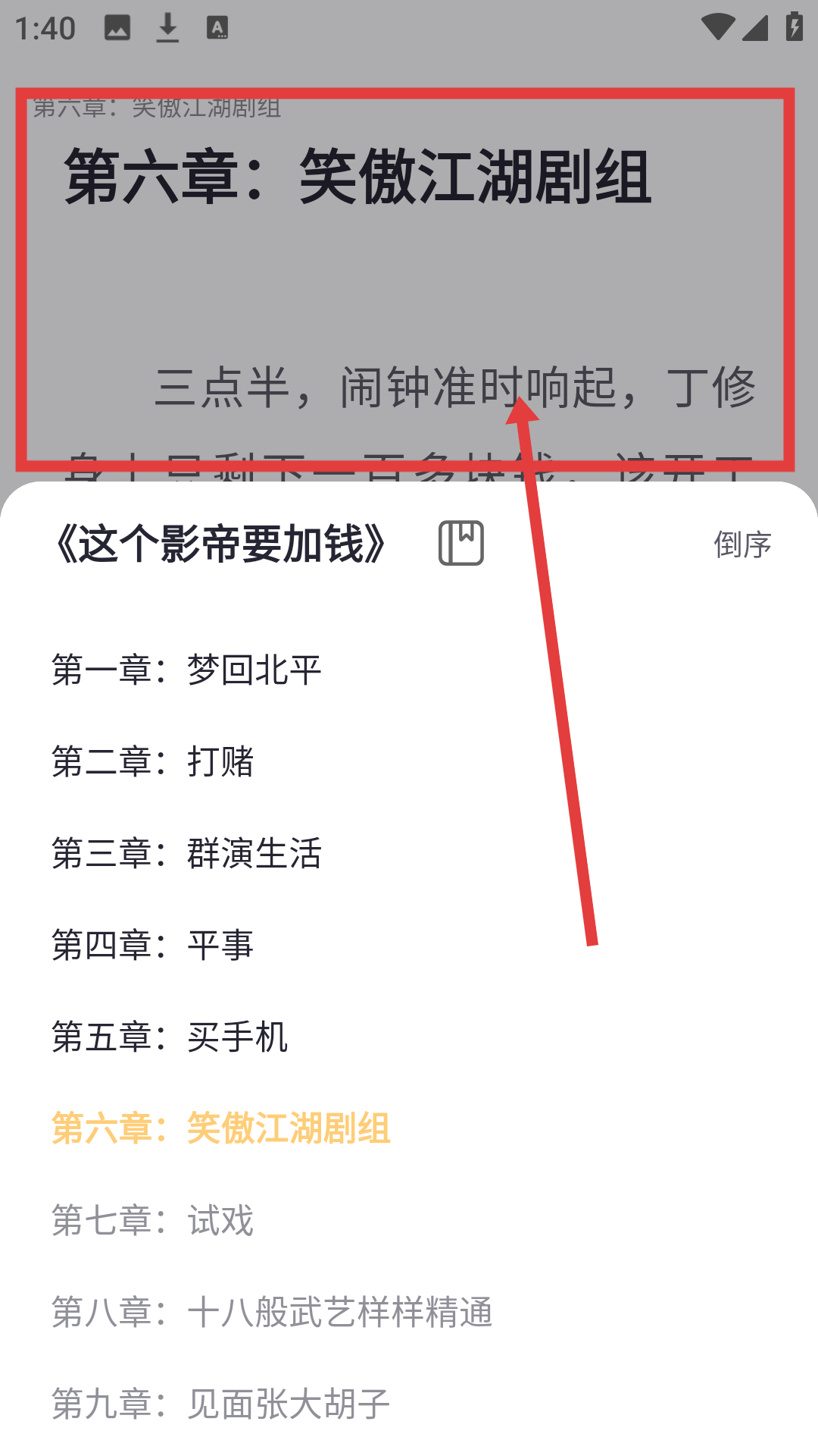 3、在章节列表选目标章节,如【第六章:笑傲江湖剧组】,准备跳转哦。