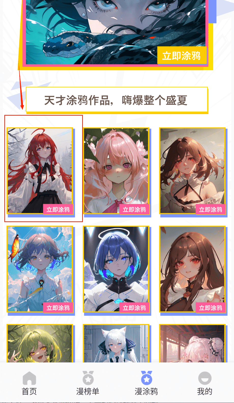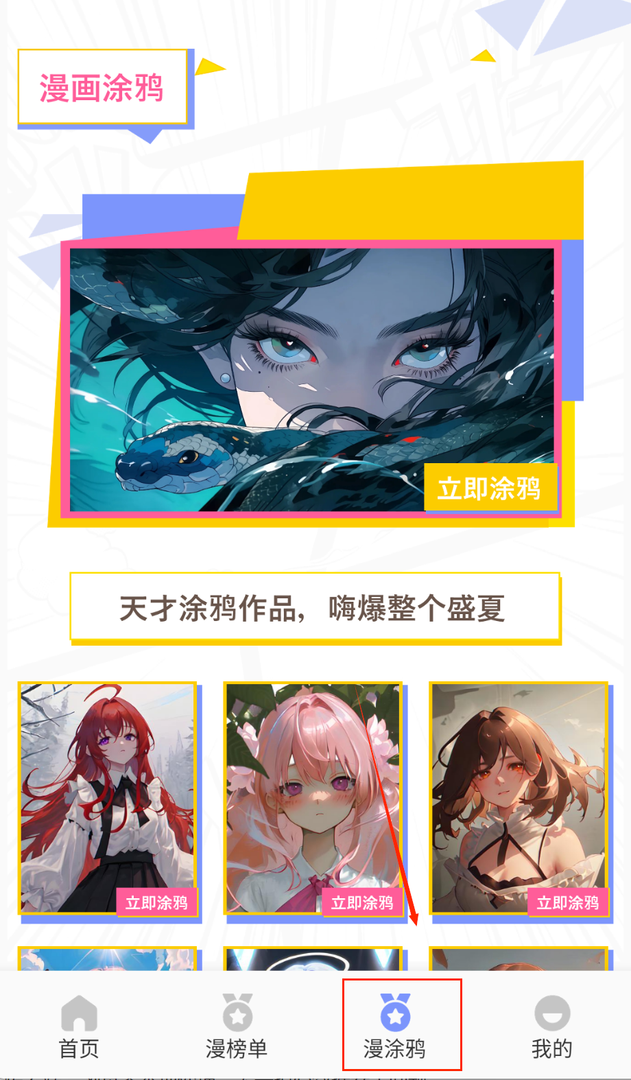 1、点击底部导航栏的"漫涂鸦"进入创意功能区,这里会展示多种风格的漫画线稿和模板,包括人物、场景等不同主题的创作素材。