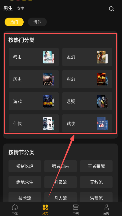 2、找书的话,可以进入“分类”页面,有热门和情节两种筛选方式,像都市、玄幻、仙侠这些热门分类。
