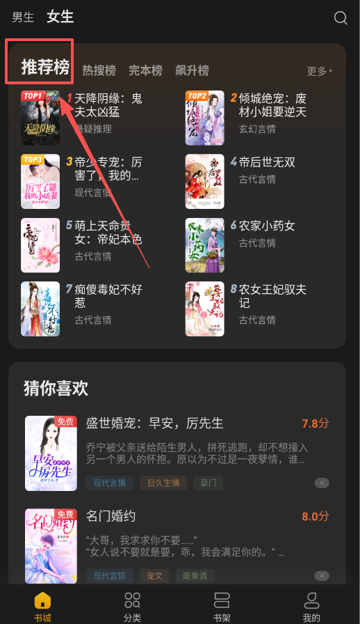 3、想追热门小说就去看“书城”的榜单,推荐榜、热搜榜、完本榜信息很全。