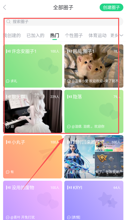 3、积极参与圈子互动能发现更多内容,在圈子页面可以看到热门推荐和全部圈子列表,还可以通过送礼物登上礼物榜。